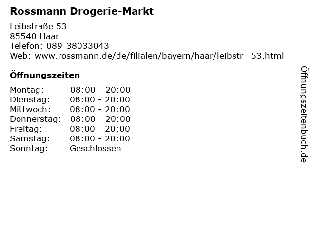 | Öffnungszeiten Rossmann Drogerie-Markt in Haar anzeigen | |