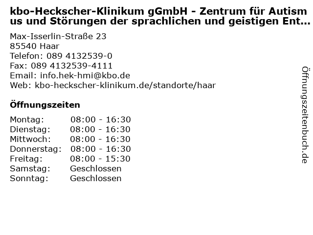 Branchen & Suchbegriffe zu kbo-Heckscher-Klinikum gGmbH - Zentrum für Autismus und Störungen der sprachlichen und geistigen Entwicklung - Sekretariat:autismus, behandlung, entwicklung, entwicklungsstörungen, geistigen, ggmbh, heckscher, kbo, kinder, klinikum, sekretariat, sprachlichen, station, störungen, tagesklinik, zentrum |