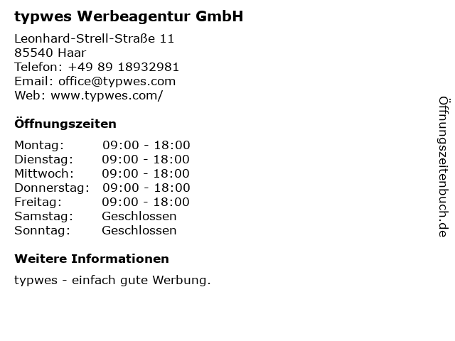 | Öffnungszeiten typwes Werbeagentur GmbH in Haar anzeigen | |