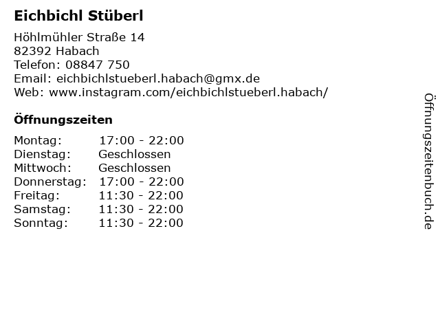 | Öffnungszeiten Eichbichl Stüberl in Habach anzeigen | |