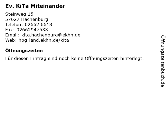 | Öffnungszeiten Ev. KiTa Miteinander in Hachenburg anzeigen | |