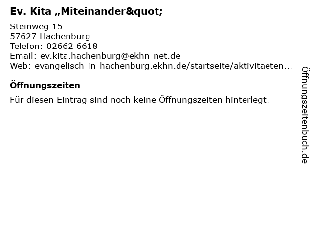 | Öffnungszeiten Ev. Kita „Miteinander" in Hachenburg anzeigen | |