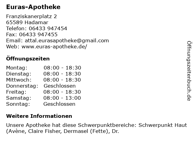 | Öffnungszeiten Euras-Apotheke in Hadamar anzeigen | |