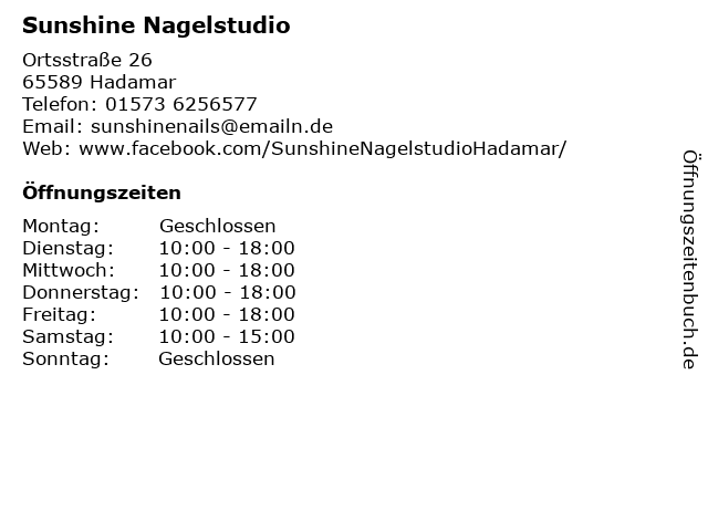 | Öffnungszeiten Sunshine Nagelstudio in Hadamar anzeigen | |