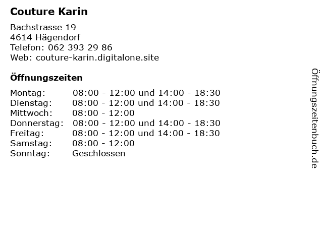 | Öffnungszeiten Couture Karin in Hägendorf anzeigen | |