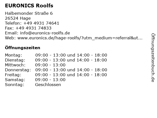 | Öffnungszeiten EURONICS Roolfs in Hage anzeigen | |