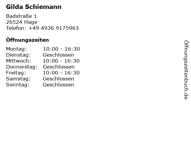 | Öffnungszeiten Gilda Schiemann in Hage anzeigen | |