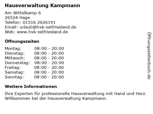 | Öffnungszeiten Hausverwaltung Kampmann in Hage anzeigen | |