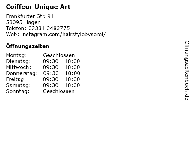 | Öffnungszeiten Coiffeur Unique Art in Hagen anzeigen | |
