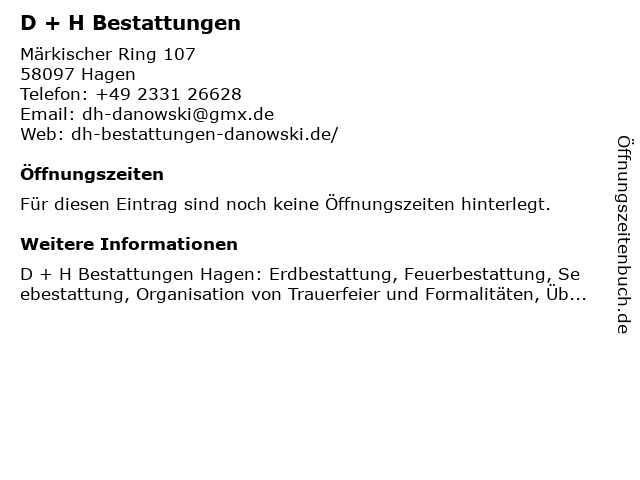 | Öffnungszeiten D + H Bestattungen in Hagen anzeigen | |