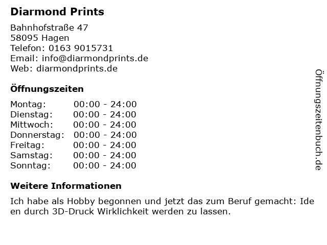 | Öffnungszeiten Diarmond Prints in Hagen anzeigen | |