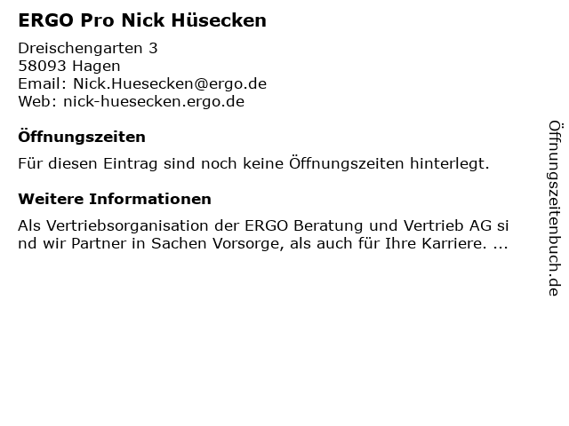 | Öffnungszeiten ERGO Pro Nick Hüsecken in Hagen anzeigen | |