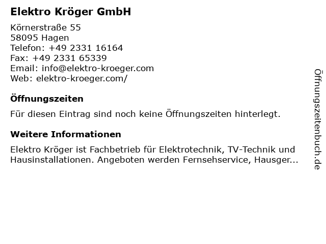 | Öffnungszeiten Elektro Kröger GmbH in Hagen anzeigen | |