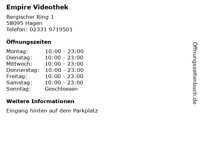 | Öffnungszeiten Empire Videothek in Hagen anzeigen | |