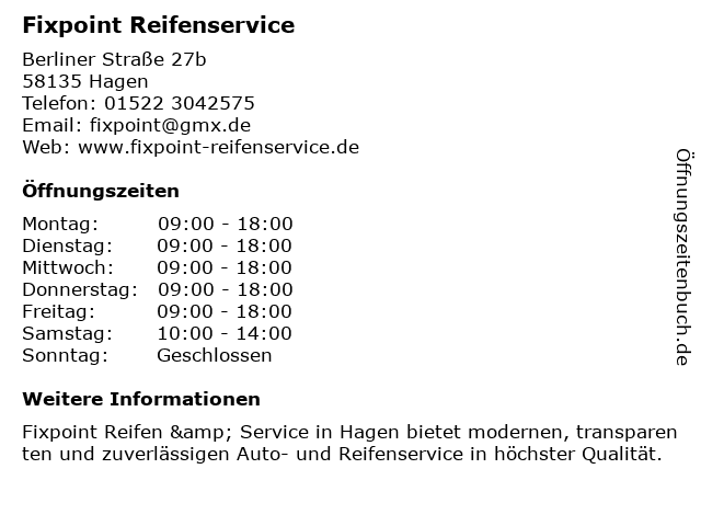 | Öffnungszeiten Fixpoint Reifenservice in Hagen anzeigen | |