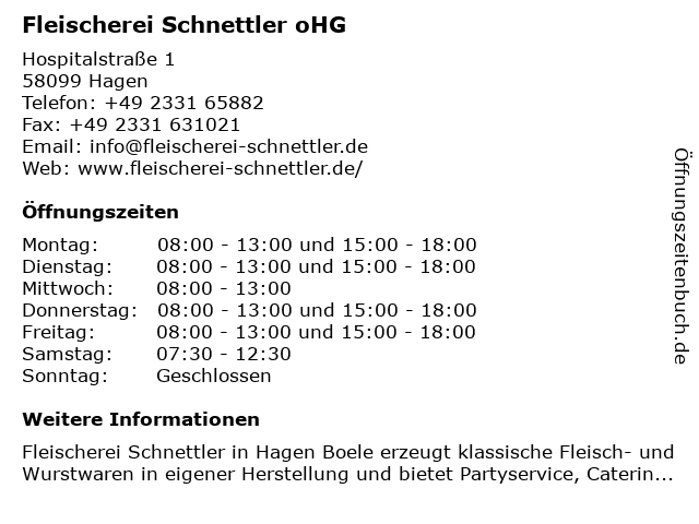 | Öffnungszeiten Fleischerei Schnettler oHG in Hagen anzeigen | |