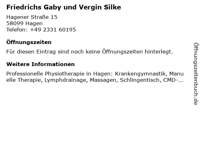 Branchen & Suchbegriffe zu Friedrichs Gaby und Vergin Silke:ayurveda-massage, beckenbodengymnastik, cmd, fango, friedrichs, fußreflexzonentherapie, gaby, hausbesuche, heiße rolle, krankengymnastik, kältebehandlung, lymphdrainage, manuelle therapie, massagen, massagepraxis hagen, mobilisation, physio hagen, physiotherapie hagen, pnf, rückentherapie, schlingentisch, silke, triggerpunktbehandlung, vergin |