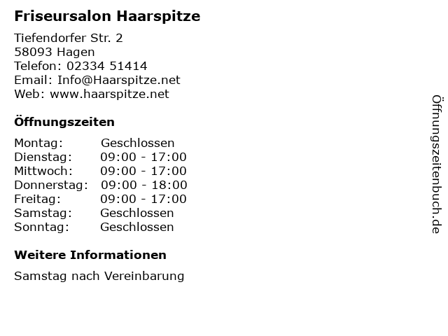 | Öffnungszeiten Friseursalon Haarspitze in Hagen anzeigen | |
