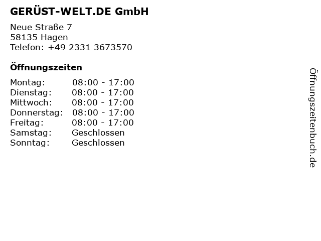 | Öffnungszeiten GERÜST-WELT.DE GmbH in Hagen anzeigen | |