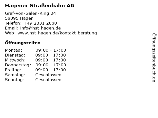 | Öffnungszeiten Hagener Straßenbahn AG in Hagen anzeigen | |