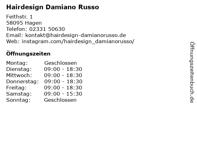 | Öffnungszeiten Hairdesign Damiano Russo in Hagen anzeigen | |