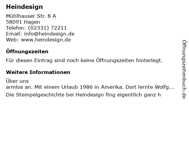 | Öffnungszeiten Heindesign in Hagen anzeigen | |