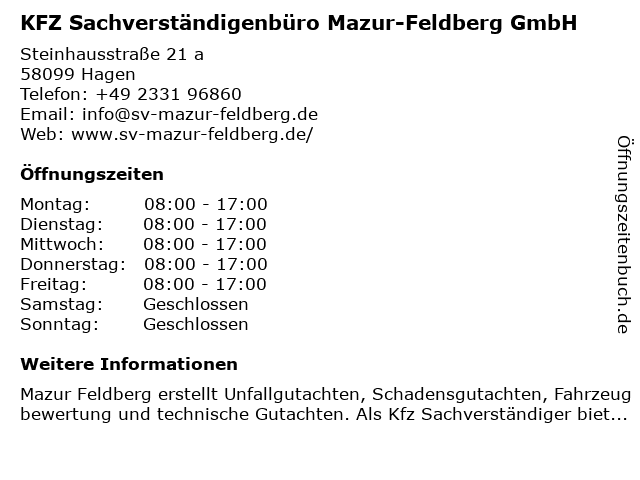 1 Sachverständigenbüro für Kfz.Dipl.- Ing. Hugo Feldberg GmbH (Entfernung: 0,00 km) Steinhausstr. 21, 58099 Hagen 2 Ilona Lungwitz Architektur- und Sachverständigenbüro (Entfernung: 5,28 km) Buscheystr. 44, 58089 Hagen 6 |