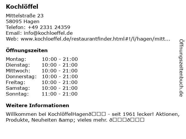| Öffnungszeiten Kochlöffel in Hagen anzeigen | |