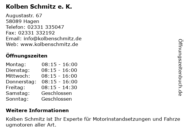 | Öffnungszeiten Kolben Schmitz e. K. in Hagen anzeigen | |