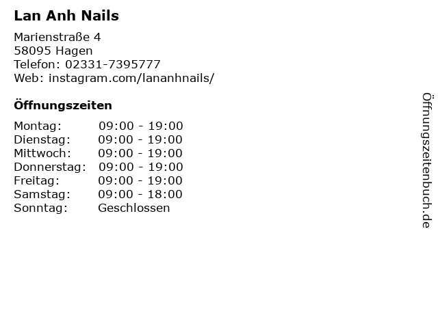 | Öffnungszeiten Lan Anh Nails in Hagen anzeigen | |