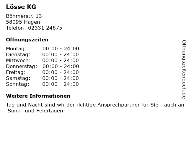 | Öffnungszeiten Lösse KG in Hagen anzeigen | |