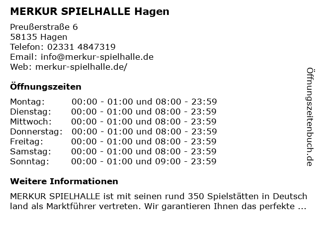 | Öffnungszeiten MERKUR SPIELHALLE Hagen in Hagen anzeigen | |
