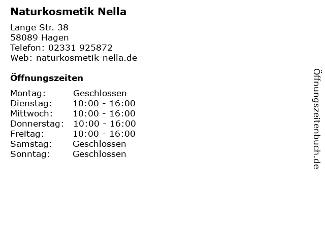 | Öffnungszeiten Naturkosmetik Nella in Hagen anzeigen | |