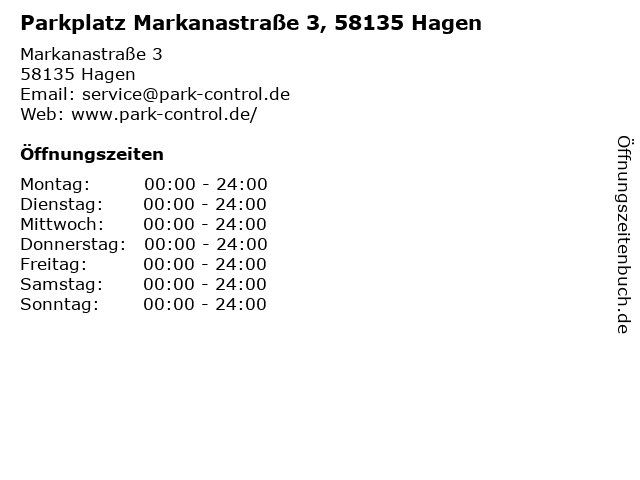 | Öffnungszeiten Parkplatz Markanastraße 3, 58135 Hagen in Hagen anzeigen | |