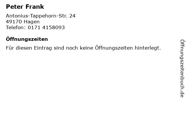 | Öffnungszeiten Peter Frank in Hagen anzeigen | |
