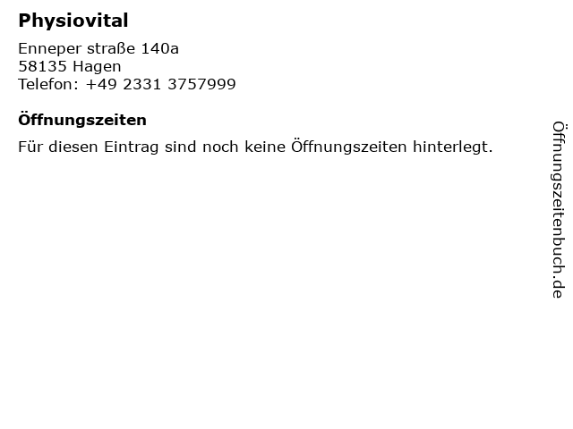 | Öffnungszeiten Physiovital in Hagen anzeigen | |