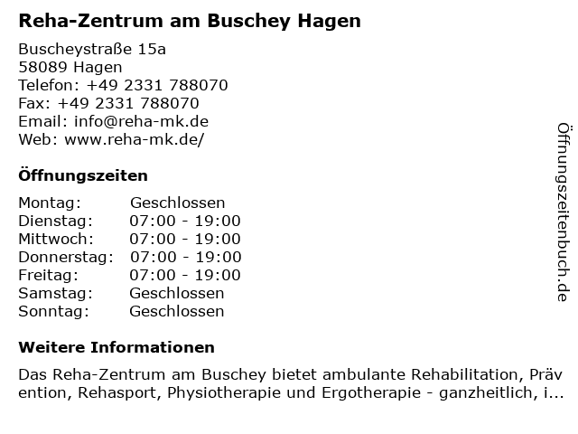 | Öffnungszeiten Reha-Zentrum am Buschey Hagen in Hagen anzeigen | |