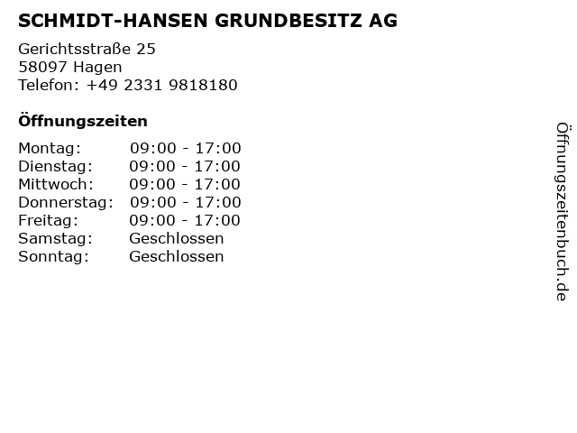 | Öffnungszeiten SCHMIDT-HANSEN GRUNDBESITZ AG in Hagen anzeigen | |