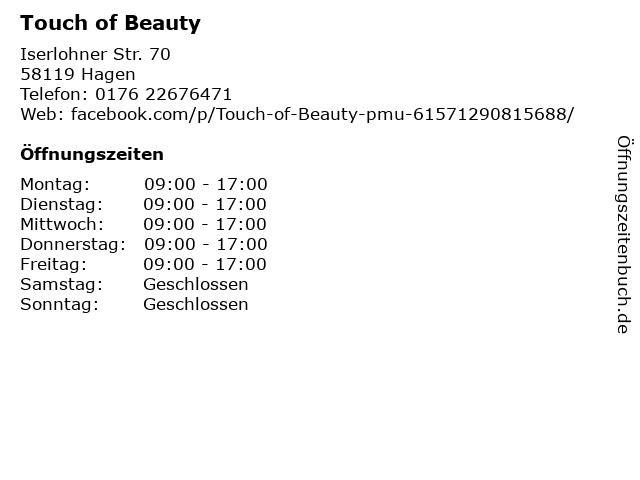 | Öffnungszeiten Touch of Beauty in Hagen anzeigen | |