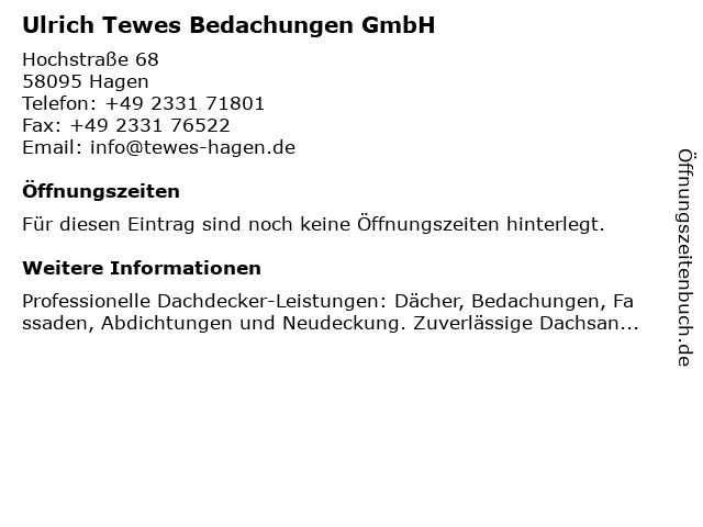 | Öffnungszeiten Ulrich Tewes Bedachungen GmbH in Hagen anzeigen | |