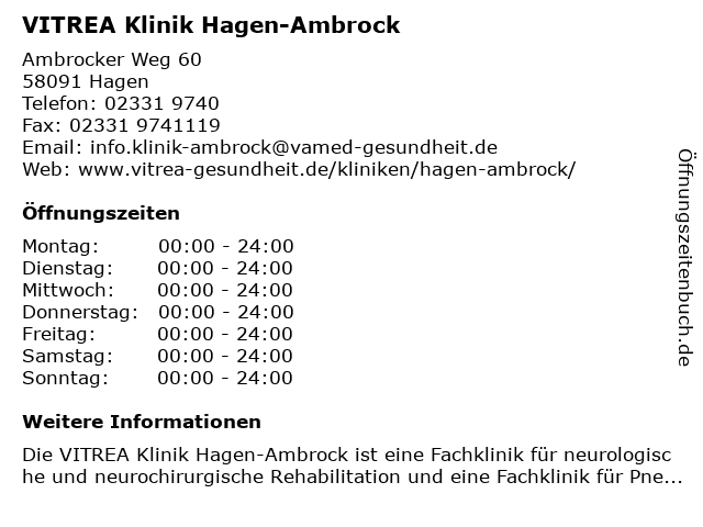 | Öffnungszeiten VITREA Klinik Hagen-Ambrock in Hagen anzeigen | |