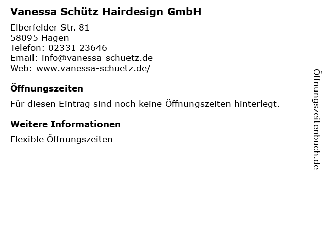 | Öffnungszeiten Vanessa Schütz Hairdesign GmbH in Hagen anzeigen | |