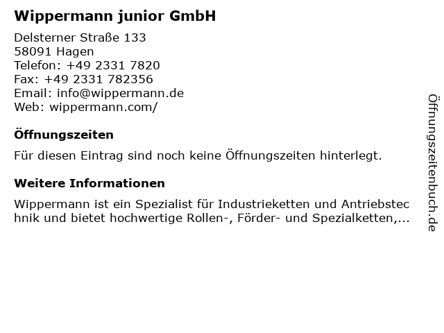 | Öffnungszeiten Wippermann junior GmbH in Hagen anzeigen | |