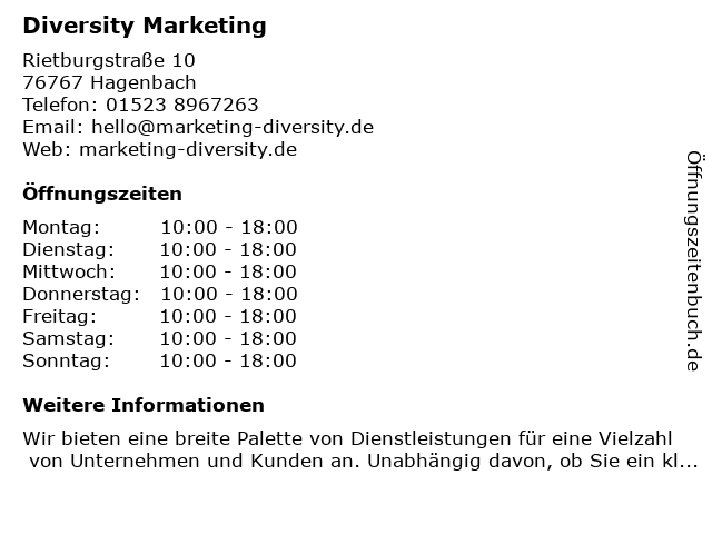 | Öffnungszeiten Diversity Marketing in Hagenbach anzeigen | |