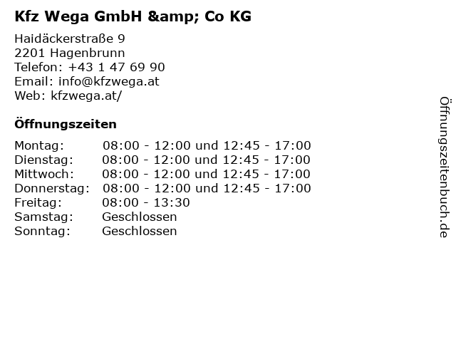 | Öffnungszeiten Kfz Wega GmbH & Co KG in Hagenbrunn anzeigen | |