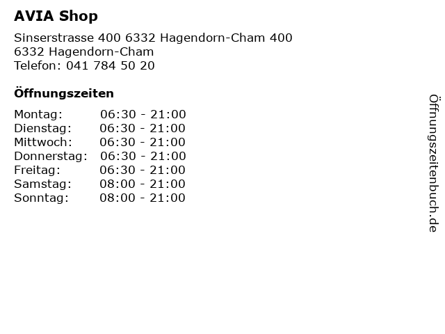 | Öffnungszeiten AVIA Shop in Hagendorn-Cham anzeigen | |