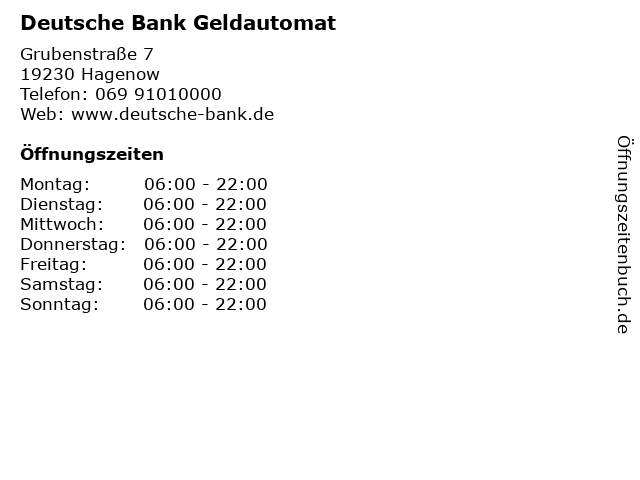 | Öffnungszeiten Deutsche Bank Geldautomat in Hagenow anzeigen | |