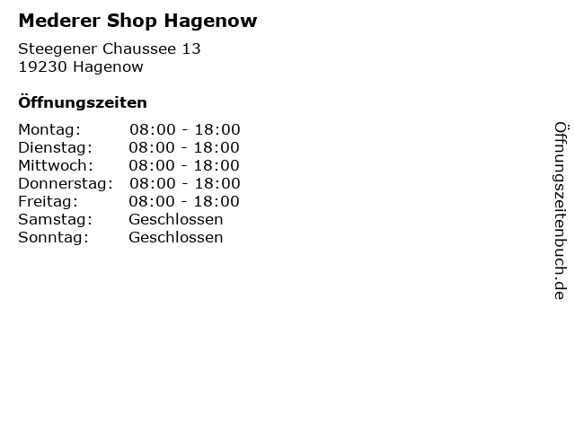 | Öffnungszeiten Mederer Shop Hagenow in Hagenow anzeigen | |