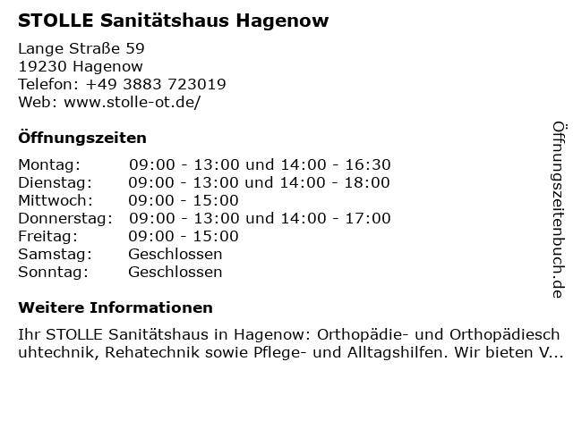 | Öffnungszeiten STOLLE Sanitätshaus Hagenow in Hagenow anzeigen | |