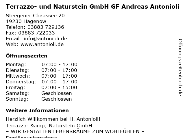 1 Peter Antonioli Terrazzo- u. BetonsteinMstr. (Entfernung: 1,04 km) Hagenower Str. 15, 19230 Pätow-Steegen 4 MGB Joachim Fliesen & Naturstein GmbH (Entfernung: 13,36 km) Warsower Str. 1, 19075 Mühlenbeck bei Schwerin 5 Reifenzentrale Adendorf GmbH - GF. Timo Schuhart (Entfernung: 52,12 km) Bunsenstraße 1, 21365 Adendorf 6 |